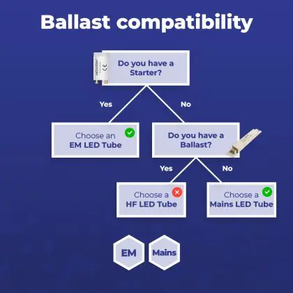 Un ballast (reattore) può essere visto come un regolatore di energia che accende l'apparecchio luminoso. C'è uno starter nell'apparecchio? Allora ci sarà anche un ballast convenzionale (EM). Gli apparecchi con un ballast elettronico (HF) non hanno uno starter. Si può paragonare un driver LED a un reattore elettronico, ma funziona solo con l'illuminazione a LED.